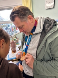 Dennis had uiteraard zijn medaille meegenomen met ook nog mooie foto’s waaronder een foto waarop hij gelauwerd werd zoals in de oudheid met een krans van olijftakken. Alle kinderen mochten de medaille bekijken en aanraken en handtekeningen werden rijkelijk uitgedeeld.